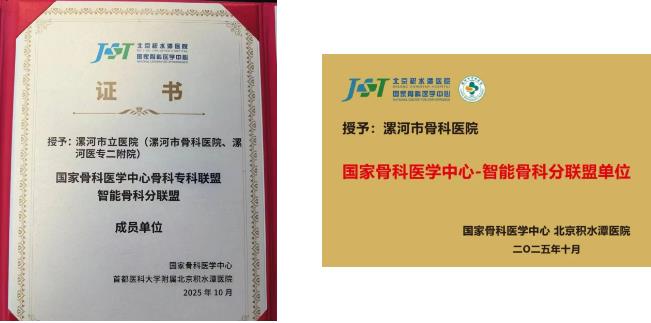 10月18日,國家骨科醫(yī)學(xué)中心骨科專科聯(lián)盟智能骨科分聯(lián)盟授牌儀式在北京積水潭醫(yī)院舉辦,漯河醫(yī)專二附院(漯河市骨科醫(yī)院、漯河市立醫(yī)院)憑借在骨科領(lǐng)域的卓越實力和創(chuàng)新探索,成為智能骨科分聯(lián)盟成員單位。