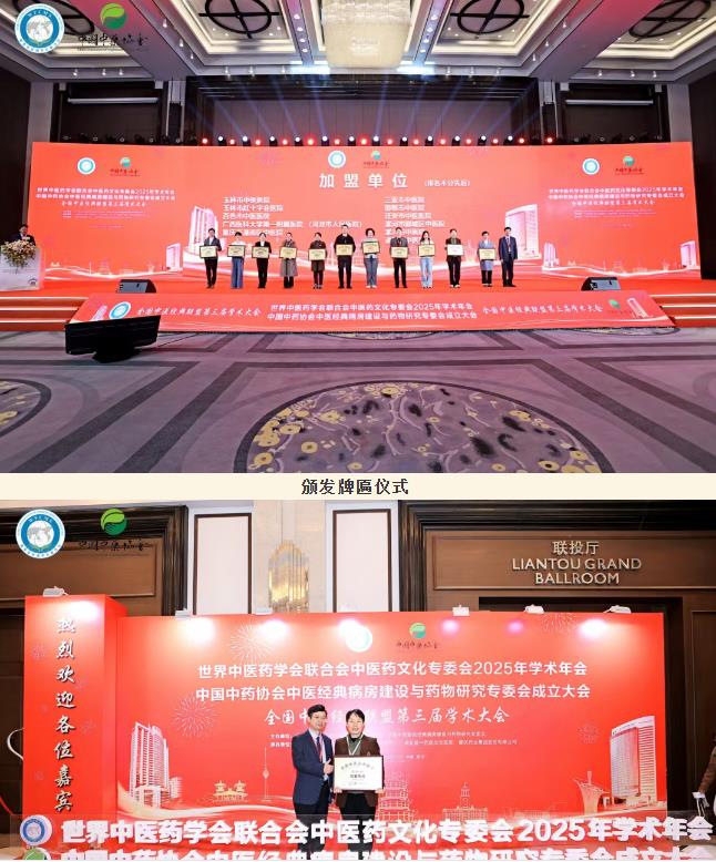 2025 年11月20-23日,世界中醫(yī)藥學(xué)會(huì)聯(lián)合會(huì)中醫(yī)藥文化專委會(huì)2025年學(xué)術(shù)年會(huì)、中國中藥協(xié)會(huì)中醫(yī)經(jīng)典病房建設(shè)與藥物研究專會(huì)成立大會(huì)暨全國中醫(yī)經(jīng)典聯(lián)盟第三屆學(xué)術(shù)大會(huì)在武漢隆重舉辦。