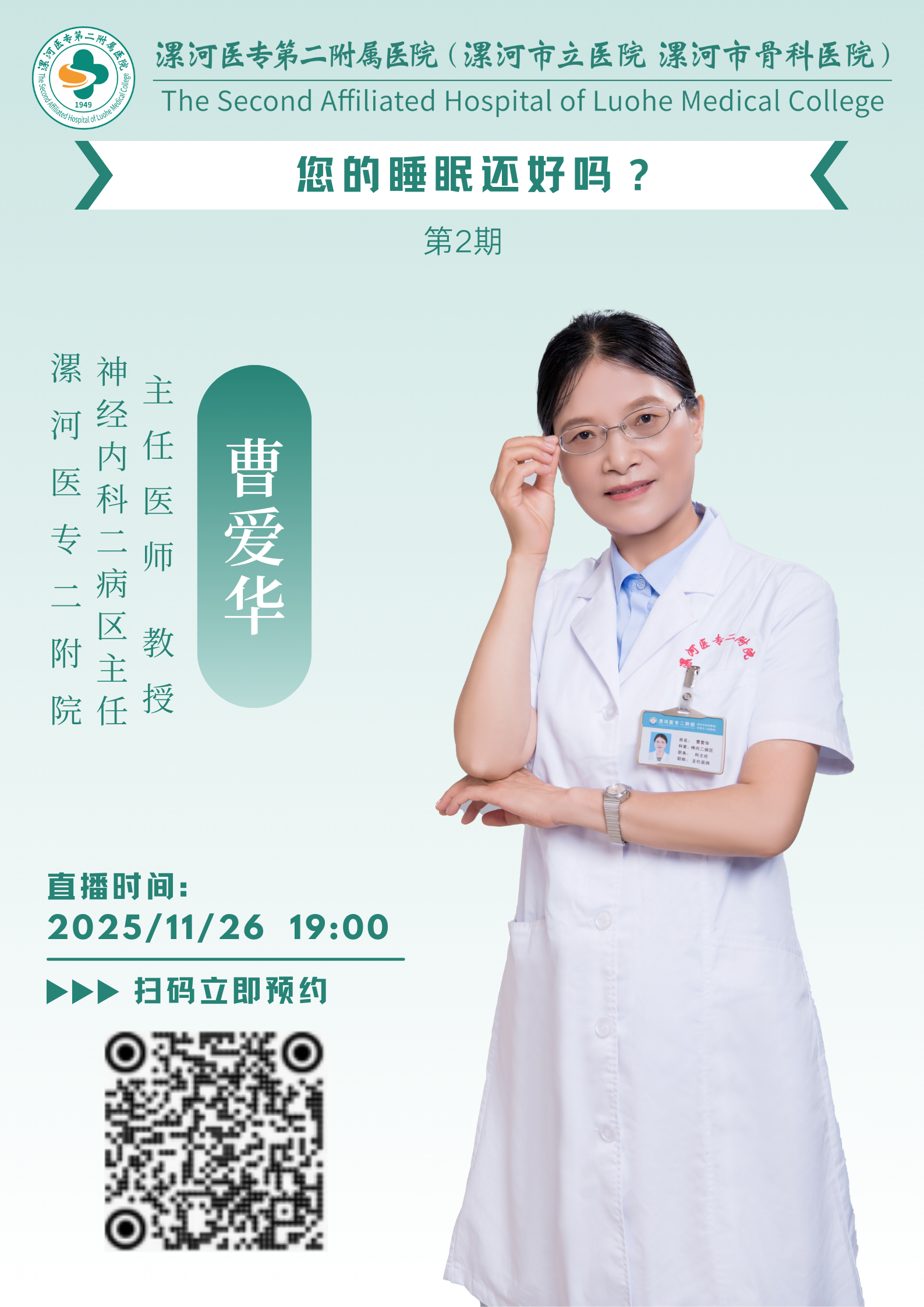 直播預(yù)告|漯河醫(yī)專二附院健康科普“云直播”第二期 您的睡眠還好嗎? “您的睡眠還好嗎?”11月26日(周三)晚7點,漯河醫(yī)專二附院(漯河市骨科醫(yī)院、漯河市立醫(yī)院)健康科普“云直播”,邀請漯河市睡眠醫(yī)學(xué)中心負(fù)責(zé)人、漯河醫(yī)專二附院神經(jīng)內(nèi)科二病區(qū)主任曹愛華教授與您共話健康睡眠,敬請關(guān)注!