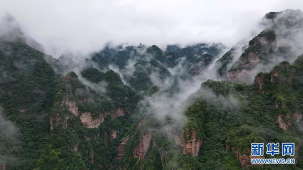 8月15日拍攝的紫金山景區(qū)(無人機照片)。 當日,位于河北省邢臺市西部太行山脈的紫金山景區(qū)云霧彌漫,美景如畫。 新華社記者 牟宇 攝