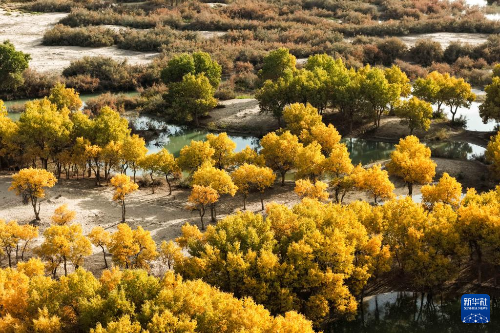 在新疆和田地區(qū)和田縣翡翠湖,成片胡楊林坐落其中(無人機照片,10月20日攝)。