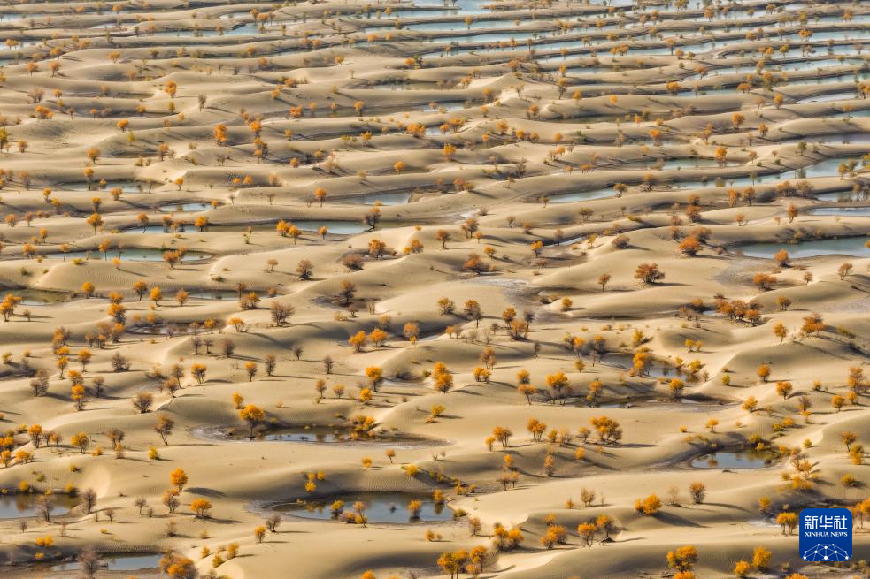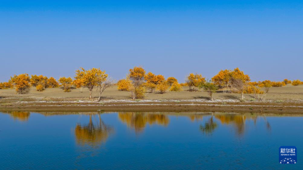 時下,新疆和田地區(qū)的胡楊迎來最佳觀賞期,成片換妝的胡楊林與水天相映,共繪金秋美景。